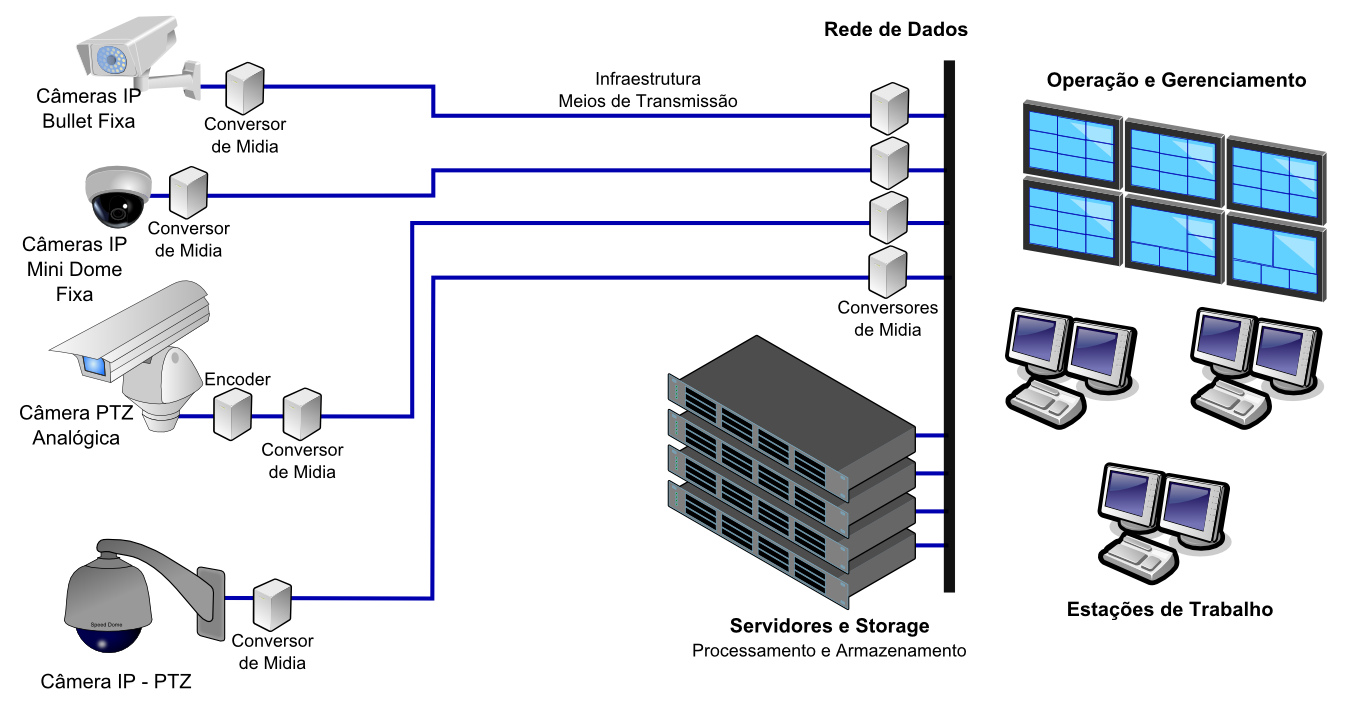 - Cabeamento dedicado ponto a ponto de cada câmera até o sistema de gerenciamento e gravação;