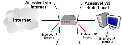 Neste diagrama o endereço IP externo é dividido em dois ou mais endereços Ips internos, onde o primeiro “Endereço IP 1” é o gateway (endereço principal), enquanto o “Endereço IP 2” é o endereço é do primeiro computador da rede local. Neste caso o roteador tem dois endereços IP, sendo um externo acessível via internet e o outro somente acessível na rede local.