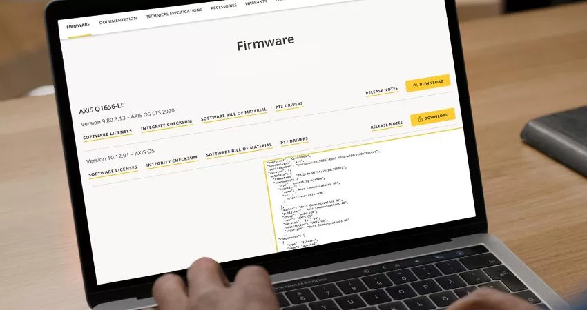 Para acessar o SBOM para AXIS OS, os usuários devem seguir o procedimento padrão para baixar o AXIS OS em www.axis.com . Um novo link permitirá que os usuários baixem e visualizem o SBOM. Eles podem então abri-lo em um editor de texto e acessar todas as informações que ele contém.