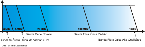 Em termos práticos as fibras óticas oferecem uma banda muito mais larga em comparação a cabos de cobre. A largura de banda dos cabos de fibra ótica está entre 100Mhz e 1000 MHz, que em comparação com os cabeamento metálico de cobre está entre 3 a 20 MHz. Esta maior largura de banda na prática permite as fibras óticas aplicações muito mais diversificadas e capacidades muito maiores de transmissão. Em relação ao CFTV poderíamos fazer uma comparação prática direta, baseando-nos na largura de banda de um sinal de vídeo que é de aproximadamente 5 Mhz, desta forma poderíamos transmitir entre 20 e 200 sinais de vídeo em um cabo de fibra ótica. Está transmissão é impossível com um cabo de cobre. Na verdade usando técnicas de compressão de vídeo e dados é possível fazer a modulação de 500 a 1000 sinais de vídeo em uma única fibra ótica.