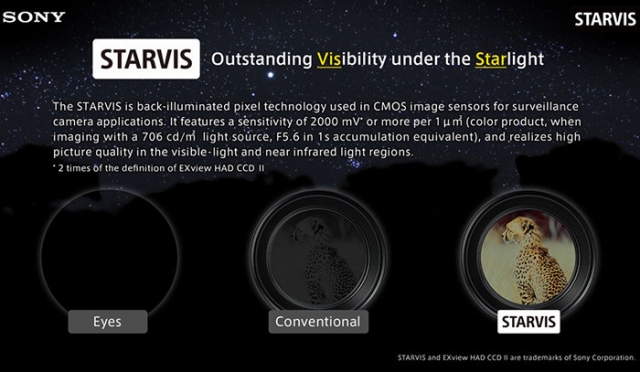 E para aproveitar toda a tecnologia já consolidada e garantir melhorias nas imagens das câmeras de segurança, que muitas vezes são prejudicadas por ambientes escuros, a Sony desenvolveu especificamente para câmeras de vigilância, o sensor STARVIS, que possui tecnologia retro-iluminada, ou seja, a imagem é formada na parte de trás, num percurso onde não há obstáculos, como fios ou circuitos, por isso, recebe uma ampla gama de luz, aumentando o desempenho da sensibilidade do sensor. Também há melhorias no infravermelho que ganha ainda mais alcance e luminosidade para filmagens durante a noite.