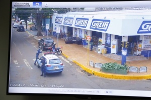 Da sala do Ciops (Centro Integrado de Operações de Segurança), onde fica a central de monitoramento, Reinaldo acompanhou a simulação em tempo real em que dois homens chegam de moto a uma loja de eletroeletrônicos da Avenida Marcelino Pires. Um deles entra e o outro fica na moto.
