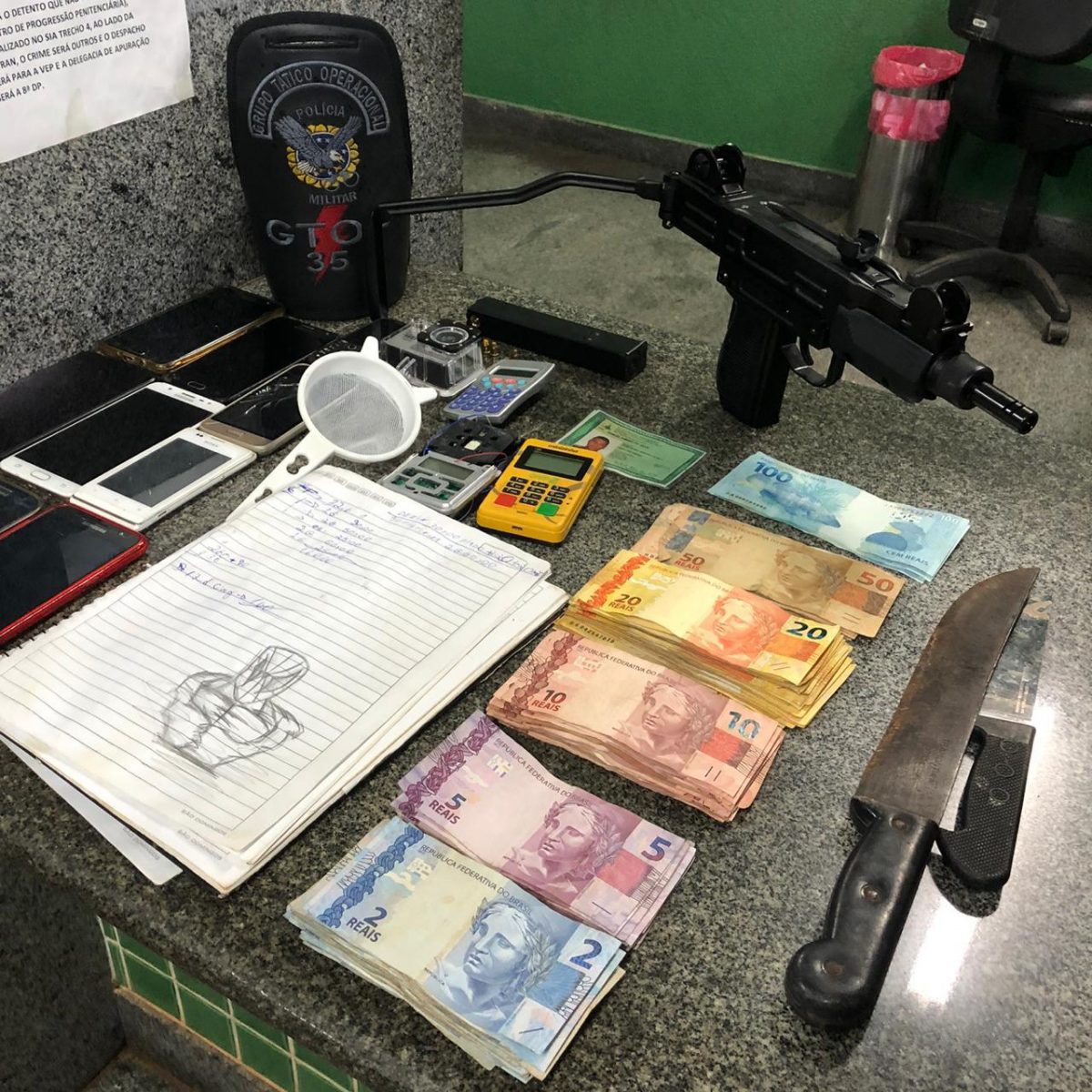 No local, foram encontrados cerca de 150 gramas de cocaína, 10 celulares, uma câmera GoPro, uma máquina de cartão, uma balança de precisão, uma calculadora, um caderno com anotações do tráfico, uma peneira, um simulacro de submetralhadora, R$2.449,00 reais, em espécie, e R$ 44,55, em moedas.