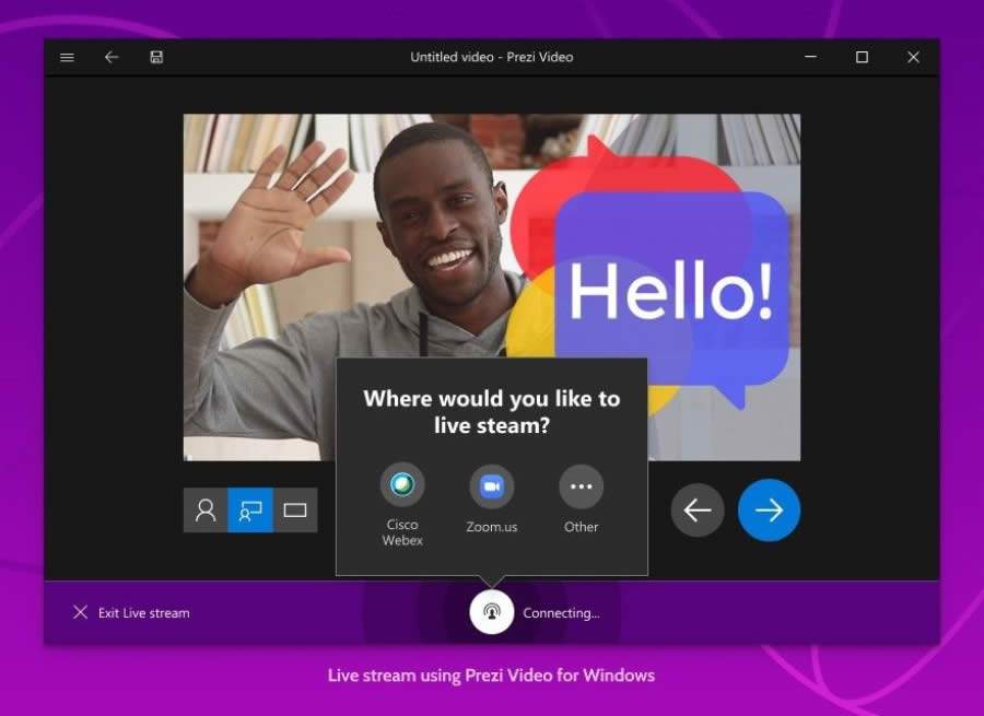 O Prezi Video é um criador de vídeos que o coloca ao lado de seu conteúdo, para que você não seja mais obrigado a escolher entre mostrar seu rosto e seus recursos visuais. É possível realizar apresentações com ferramentas de videoconferência, incluindo Webex , Zoom , GoToWebinar .