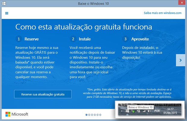 Para isso, deverão clicar no ícone do Windows no canto inferior à direita na barra de tarefas, escolher a opção “Reserve your free upgrade” e digitar o e-mail para receber a confirmação de reserva (veja abaixo). Assim que o Windows 10 sair, uma notificação será enviada.
