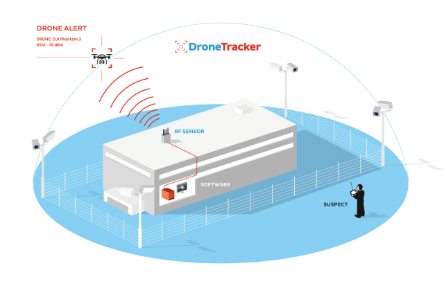 Será demonstrado em um monitor o software DroneTracker da Dedrone que estará conectado a um sensor de freqüência de rádio (RF) e Wi-Fi e, em seguida, usando câmeras Axis receberá o feed de vídeo do espaço aéreo. Os dados coletados desses sensores são então analisados pelo DroneTracker para mostrar se um drone entrou na área protegida podendo determinar sua localização. O DroneTracker é uma poderosa plataforma de aprendizagem de máquinas, permitindo que a Dedrone atualize continuamente o software e assegure que seus recursos de verificação sejam os primeiros a encontrar todas as ameaças de drone. Quando um drone não autorizado entra em espaço aéreo protegido, o DroneTracker envia automaticamente um alerta e pode implantar uma medida de proteção. As câmeras IP AXIS que são usadas para este propósito fornecem excelente clareza de imagem e são ideais para uso externo e alguns modelos são do tipo PTZ podendo ser comandadas remotamente buscando detalhes da imagem para uma melhor busca do piloto do Drone