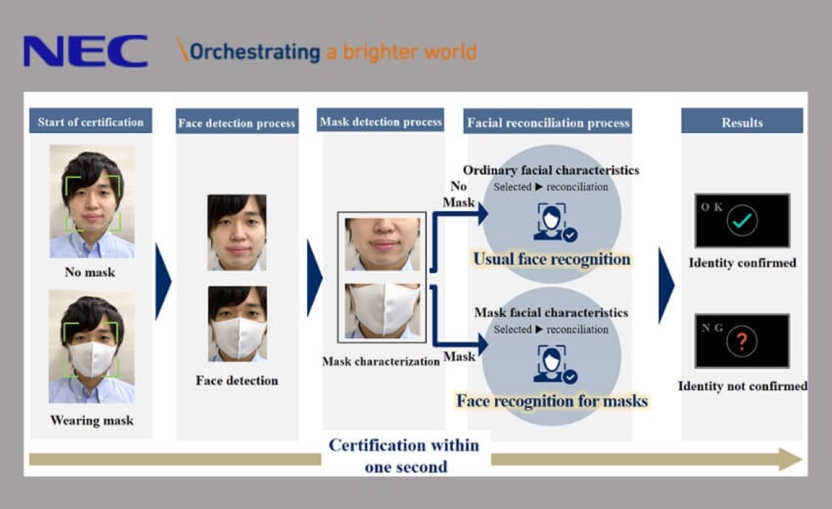 A NEC tem um histórico estabelecido de desenvolvimento de tecnologia de reconhecimento facial compatível com máscaras faciais, mas recentemente desenvolveu um mecanismo especialmente projetado para reconhecer pessoas usando máscaras faciais.