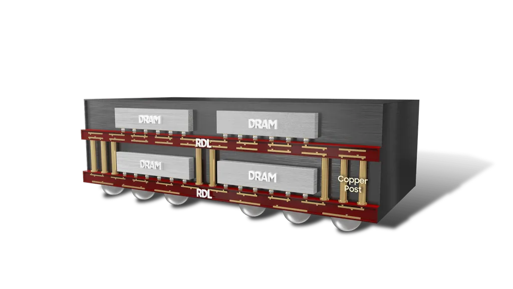 Normalmente, quando esse empilhamento é feito, o tamanho total do chip aumenta, e é nesse ponto onde o FOWLP é empregado: em vez de utilizar uma placa de circuitos (PCB) para implementar a DRAM, a gigante instala as memórias diretamente no disco de silício, e adota o que chama de camadas de redistribuição (RDL) para usar fios de cobre mais finos que alimentam a DRAM e transmitem os dados.