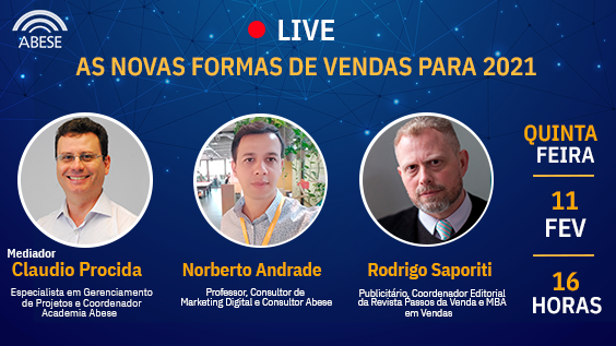 No dia 11/02 a partir das 16h, temos um encontro marcado para a live “As Novas Formas de Venda em 2021” entre Noberto Andrade (Professor, consultor de marketing digital e consultor Abese) e Rodrigo Saporiti (Publicitário, coordenador editorial da revista Passos da Venda e MBA em Vendas) mediado pelo Claudio Procida (Especialista em gerenciamento de projetos e coordenador da Academia Abese).