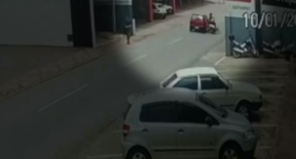 Câmeras de monitoramento registraram a colisão entre a motocicleta e um carro na Rua Prudente de Moraes.