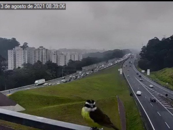A famosa câmera de monitoramento de tráfego da CCR AutoBAn trouxe mais um visitante inusitado esta semana. Um bem-te-vi (Pitangus Sulphuratus) pousou em frente à câmera localizada no km 13 da Rodovia dos Bandeirantes (SP-348), próximo à Marginal Tietê, em São Paulo, na manhã desta terça-feira, 3 de agosto. O flagrante aconteceu por volta das 8h40.