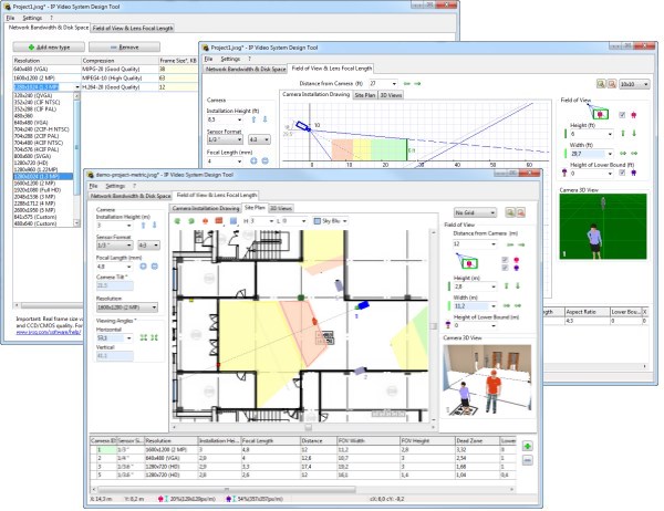 Software para cálculo de lentes e posicionamento de câmeras de CFTV, um projeto completo com desenho e estimativa de posicionamento e campo de visão de câmeras. Permite também a estimativa de banda de rede e espaço em disco utilizado por câmeras IP. Também pode servir como referência para cálculos relacionados a DVRs, NVRs e Servidores.